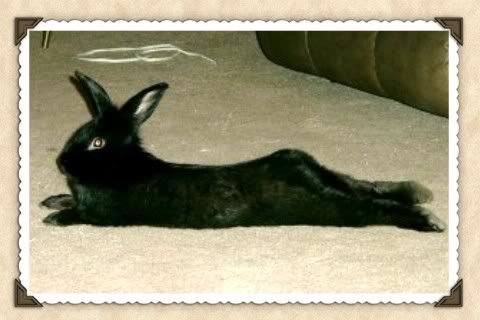 Saturday, Steve and I adopted a bunny! He's a show bred black lionhead. His main didn't turnout so he is cinsidered a "show reject". We finally decided on a name, Reese. That only took 2 days! What a sweetie though. He lets us pick him up, when he feels like it, he jumps up on the couch with us and he's litter trained! Possibly best of all, the cats don't seem to mind him at all, nor he the cats.