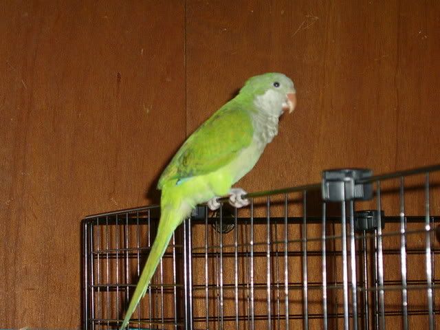 On Thursday I got a four and a half month old Quaker Parrot. He hatched 6/30/06. Last night we finally decided on a name for him, Dewey. A couple days ago he figured out that he can fly. Well, kind of, his wings are clipped but he can take of just a little then glide to the ground. Yesterday he discovered squawking. He had been doing it every here and there but now if I leave the room and he doesn't want me to, he'll squawk and he wont stop till I come in and get him. I've been hanging a clothing hanger on the cupboards and he perches on it while I do dishes or I'll hang it from the ceiling fan in the living room. We took him to a couple pet stores Sunday. he enjoys the car and talking to other birds. He gets to go to the vet today for his free check up.